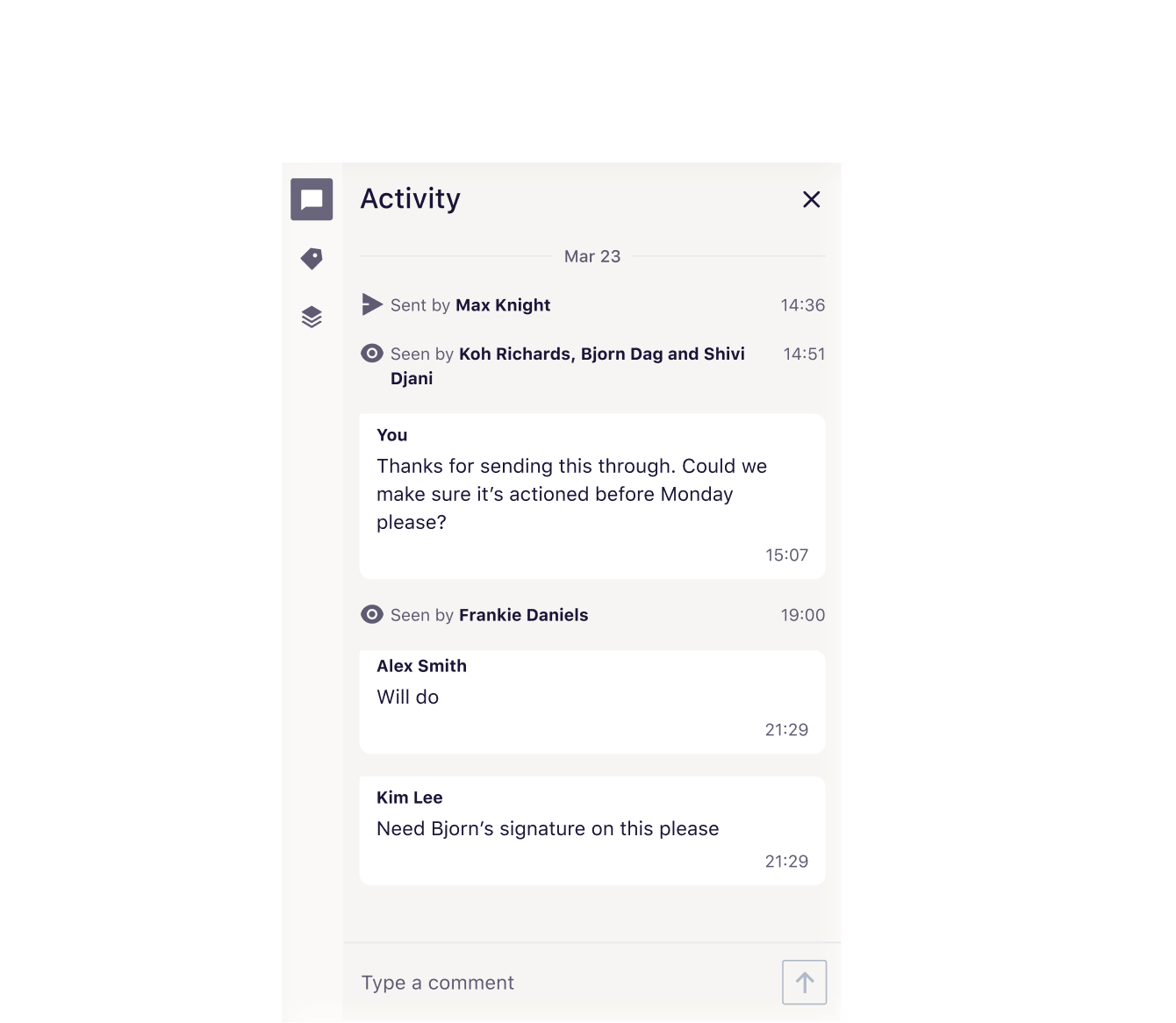 Total visibility into who's replied and what's been done. Collaborate on drafts, discuss next steps in the Activity Panel. No more forwarding chains or chasing updates.