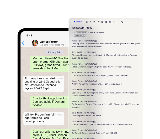 Cargo & Tonnage Lists pull opportunities from your inbox into customisable views. Update via WhatsApp or Teams, declutter emails about the same fixture, build views for preferred partners. Commercial intelligence designed for how you actually work.